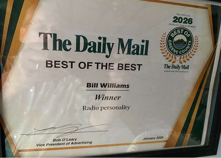 I picked up my award on Monday from the Daily Mail offices in Hudson. It is quite an honor, after 50 years of broadcasting, to be voted the best by the citizens of Greene County. Thank you all for your support!!