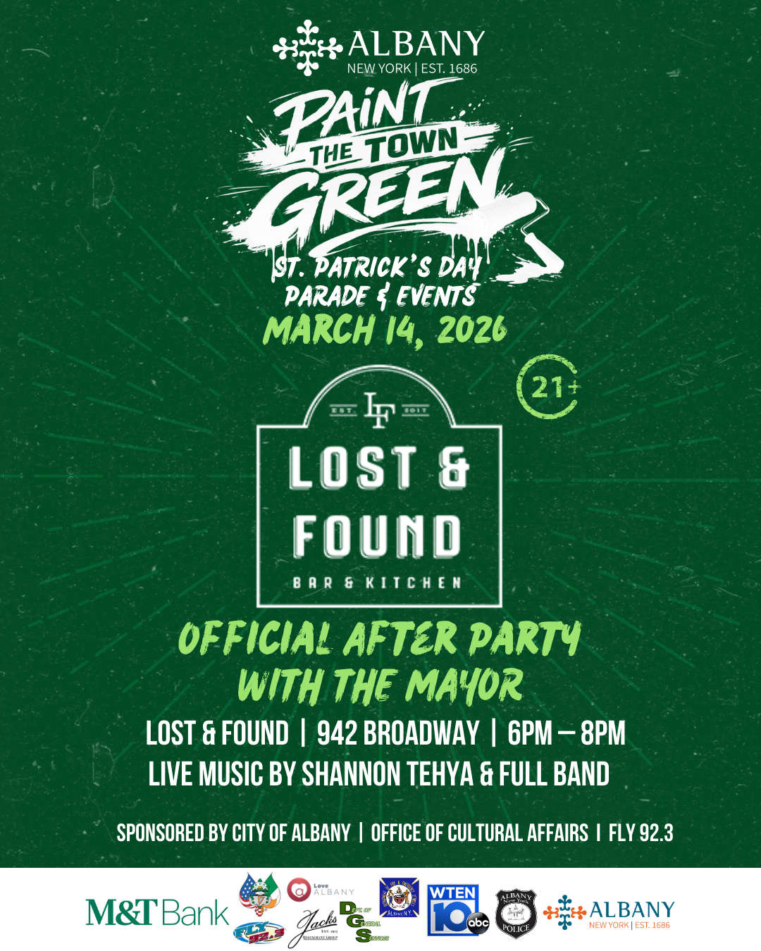 Families can also enjoy extra fun at the Paint the Town Green Kids Zone, presented by the City of Albany and M&T Bank. Located at the corner of State and Pearl Streets from noon to 4 PM, the Kids Zone offers a family-friendly spot to keep the celebration going on parade day. When the festivities wrap up, adults can continue the celebration later that evening at the official Paint the Town Green After Party (21+) from 6–8 PM at Lost & Found.